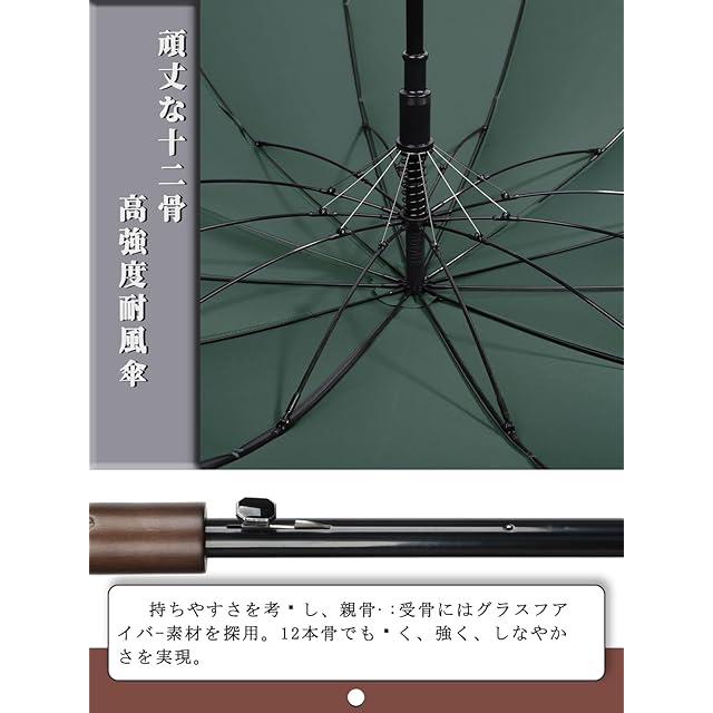 【激しい豪雨&台風対抗の頑丈な12本骨構造】暴風に応対性が強くなるため、骨組みに工夫を凝って頑丈なグラスファイバー製の12本の傘骨を採用しているのおかげで、アルミニウム合金製の傘より優れた耐風性を持っています。強い風でひっくり返っても、開閉スイッチを押したら、骨が曲がることなく、すぐ元通りになります。かなり耐久性に優れ、暴風雨、台風の天候でも容易に割れたり折れたりする心配がありません。耐久性が長くて安心して使える傘になります。