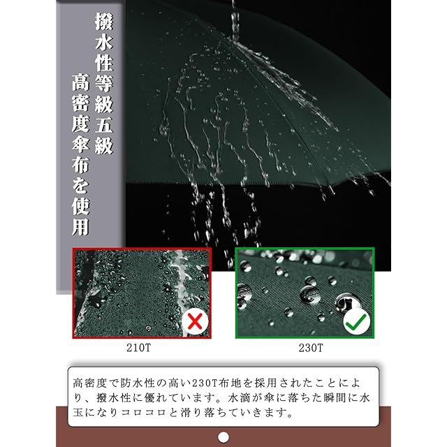 【撥水性等級5級】高密度で防水性の高いの230T防水布地を採用されたことにより、撥水性に優れています。水滴が傘に落ちた瞬間に水玉になりコロコロと滑り落ちていきます。また、汚れ防止の効果も有り、汚れには強い生地となります。丈夫な傘骨に合わせて激しい暴風雨にも対抗でき、水漏れや強風による割れなどの心配が全然有りません。長い間使えます。
