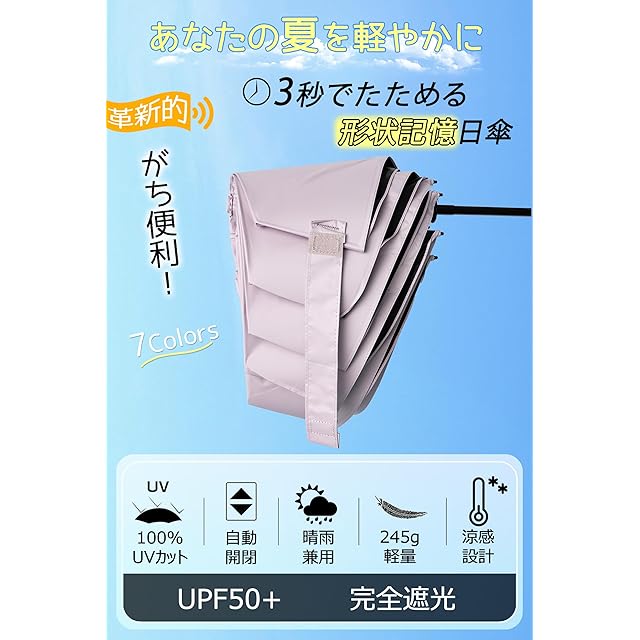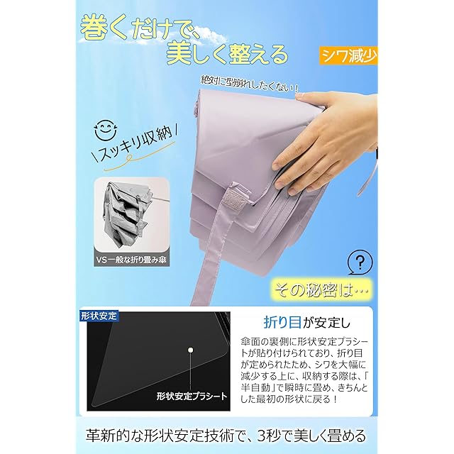 【形状安定&3秒で収納】夏の強い日差しからあなたを守る、スタイリッシュな日傘!革新的な形状安定技術で、わずか3秒で美しく折り畳める。普通の雨傘は折りたたみにくく、さらに日傘の場合、遮光設計により、傘布がシワになりやすいという大きな欠点を持っています。折りたたむとしんどくなります。こちらの形状安定日傘でそんな悩みを解消できます!傘面の裏側にPET樹脂プレートが貼り付けられており、折り目が定められたため、シワを大幅に減少する上に、傘を閉じた後、「半自動」で瞬時に畳め、きちんとした最初の形状に戻る!