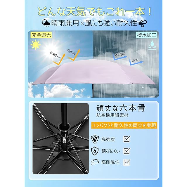 【晴雨兼用&耐風構造】天候を気にせず、自由に出かけよう!晴天では強力な紫外線カットで肌を守り、突然の雨でも頼れる防水性能でサッと対応。 航空級素材の傘骨は耐腐蚀性に優れ、過酷な天候でも折れにくい驚異の強度と耐久性を発揮。超撥水の生地で雨をしっかり弹く、毎日のお出かけに信頼のパートナー。