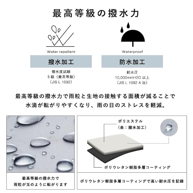 【最高等級の撥水力】 最高等級の撥水力で雨粒と生地の接触する面積が減り、水滴が玉のように転がりやすくなることで雨の日のストレスを軽減します。 ▼裏面に施した多層のポリウレタンコーティングにより、10,000mmを越える耐水圧を記録。 (JIS L 1092 A法) ▼最高等級の撥水力。撥水度試験5等級(最高等級)(JIS L 1092法)