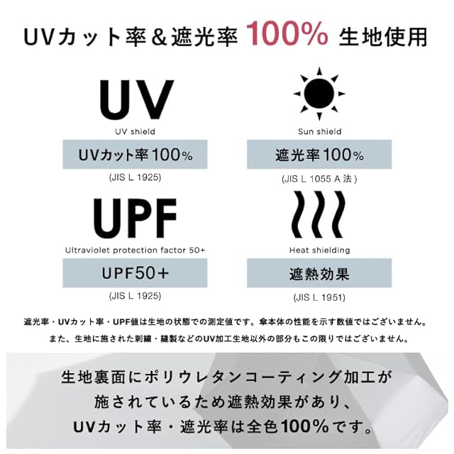 【遮光率・UVカット率100%、UPF50+】 全カラー遮光率・UVカット率ともに100%、UPF50+を実現し、日差しからお肌を守ります。 涼しく過ごすための遮熱性も優れているため、暑い夏の熱中症対策にも。