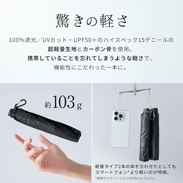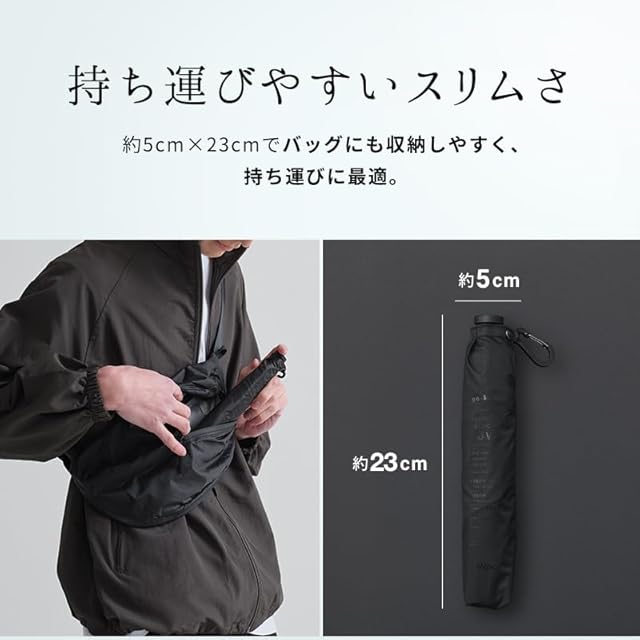 【驚きの軽さ 約103g】 ハイスペック15デニールの超軽量生地とカーボン骨を使用した非常に軽い晴雨兼用傘。 親骨55cmの少し大きめサイズで、収納時サイズは約23×3cm。 小さなバッグや、ビジネスバッグの隙間にもすっと収まり、持ち運びもノンストレス。 荷物を最小限にしつつ、雨や日差しをしっかりガードしたい方におすすめです。