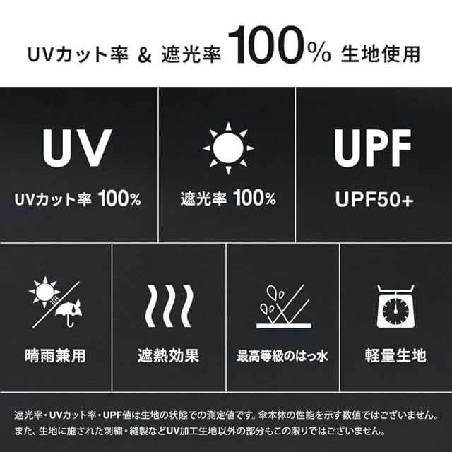 【最高等級の遮熱・遮光・遮蔽率】 15デニールのとても薄い生地でありながら、傘の専用メーカーとして長年培ったノウハウを集約し、生地の品質を保っています。 生地裏面にポリウレタン樹脂コーティングを施すことで、遮光率/遮蔽率は100%、UPF値50+の最高等級、遮熱効果も兼ね備え、日傘にとって必要な機能もハイレベルで実現しています。