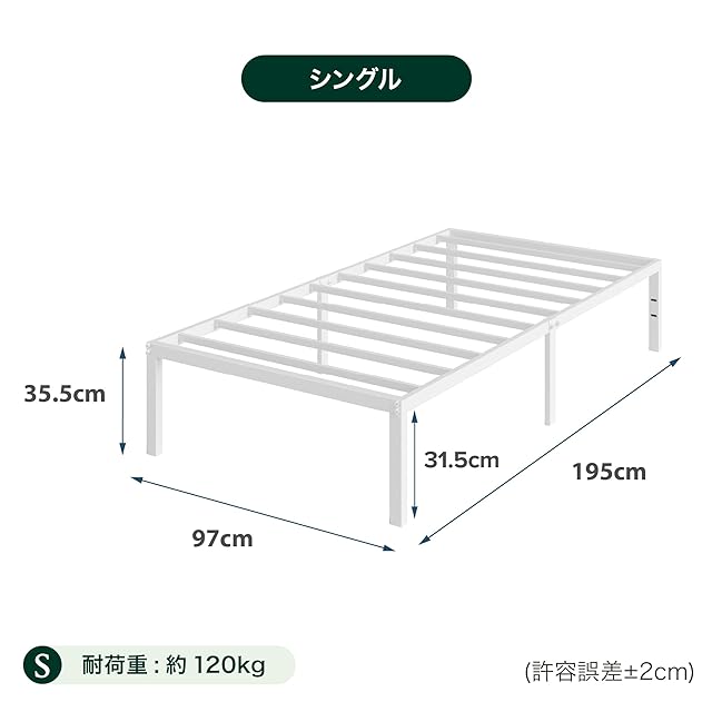 商品サイズ:幅97cm×奥行195cm×高35.5cm、重量:9.72kg、ベッド下収納高:31.5cm、耐荷重:120kg、組立目安:15-30分(大人2人以上推奨)