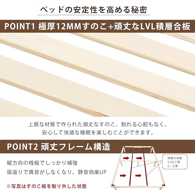【頑丈で高耐久なフレーム設計】厚いすのこと独自のフレーム構造により、驚異的な耐久性を実現。圧力分散設計により安定性が向上し、耐荷重は200kgまで対応(強度耐久試験に合格)。耐久性に優れたLVL積層合板のすのこを使用しているため、割れる心配はありません。さらに、縦の支柱で強力に補強されており、安心して深い眠りをお楽しみいただけます。