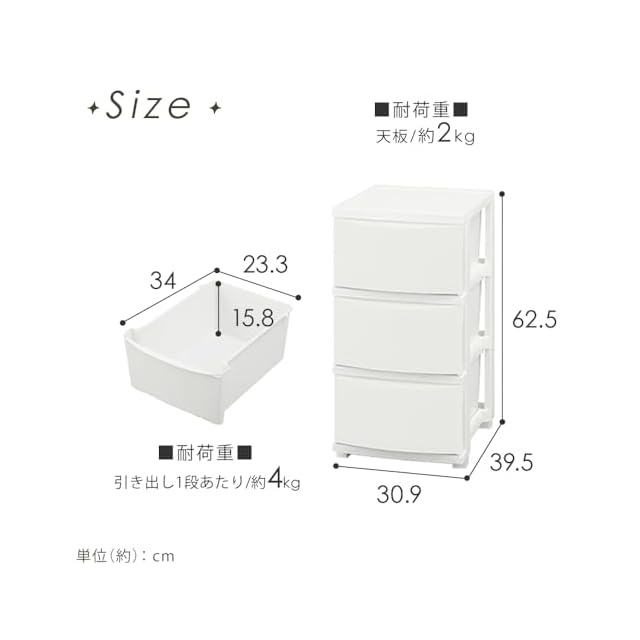 収納目安(引き出し1段あたり)は「Tシャツ:約8枚」または「バスタオル:約2枚」。