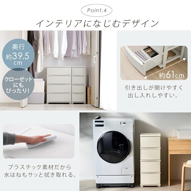 収納目安(引き出し1段あたり)は「Tシャツ:約8枚」または「バスタオル:約2枚」。