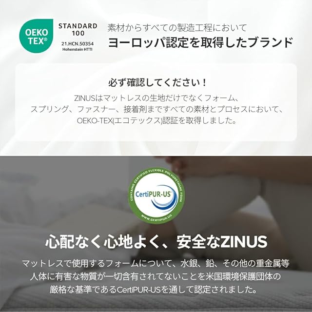 【安全認証】 耐久性、性能、素材の安全性検査である米国の「CertiPUR-US」、および世界水準の有害物質規制である「エコテックススタンダード100」の認証を取得しています。