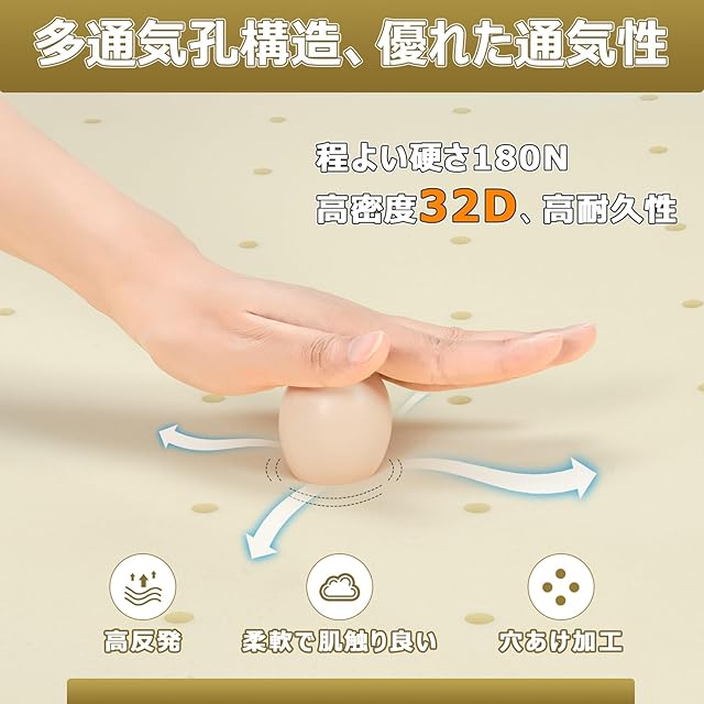 【最新設計・3つ独自開発の加工技術】日本の開発チームより新開発された高反発ウレタンフォームは背骨のS字カーブにぴったりフィットし、穴あけ加工も追加されたため、普通のウレタンより通気性、復元力に優れています。外カバーは特有の抗菌防湿・毛玉防止・汚れ防止加工を施しました。最高質感のマットレスで極上の寝心地を手に入れましょう!