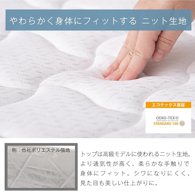 【素材】【表地】ニット生地(ポリエステル100%)【裏面】不織布【内部】ポケットコイルスプリング、不織布・ウレタンフォーム・フェルト