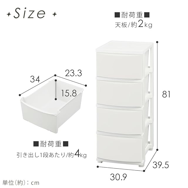収納目安(引き出し1段あたり)は「Tシャツ:約8枚」または「バスタオル:約2枚」。