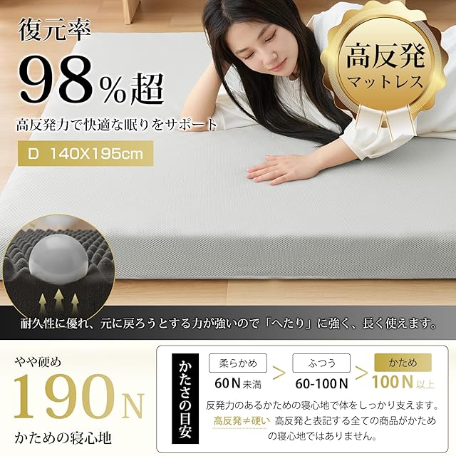 【高反発素材マットレス】弊社のマットレスは高反発素材を採用しており、優れた復元性とクッション性を兼ね備えています。復元率98%超高反発力で快適な眠りをサポートできます。密度24Dで、ぐっと押しても、すぐに戻る高反発マットレスです。10cm極厚でしっかりとした厚みとクッション性があるので、床に直接敷いても底つき感なく快適に使えます。やや硬め190Nの程よい硬さで、しっかり体を支えています。
