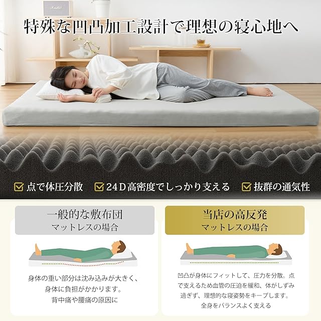【凹凸加工、体圧分散】マットレスは特殊な凹凸加工設計で、面でなく点でフィットして、圧力を分散します。点で支えるため血管の圧迫を緩和、体がしずみ過ぎず、理想的な寝姿勢をキープします。全身をバランスよく支えて、体に負担のかからない快適な眠りをサポートします。