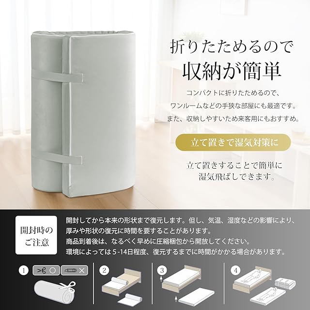 【コンパクトで収納便利】マットレスコンパクトに折りたためるので、ワンルームなどの手狭な部屋にも最適です。また、収納しやすいため来客用にもおすすめ。女性でも持ち運びもラクラクになります。コンパクトで様々な場所で使用できます。女性も楽に持ち運べます。また立て置きすることで簡単に湿気飛ばしできます。