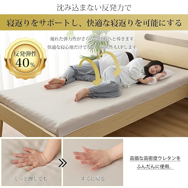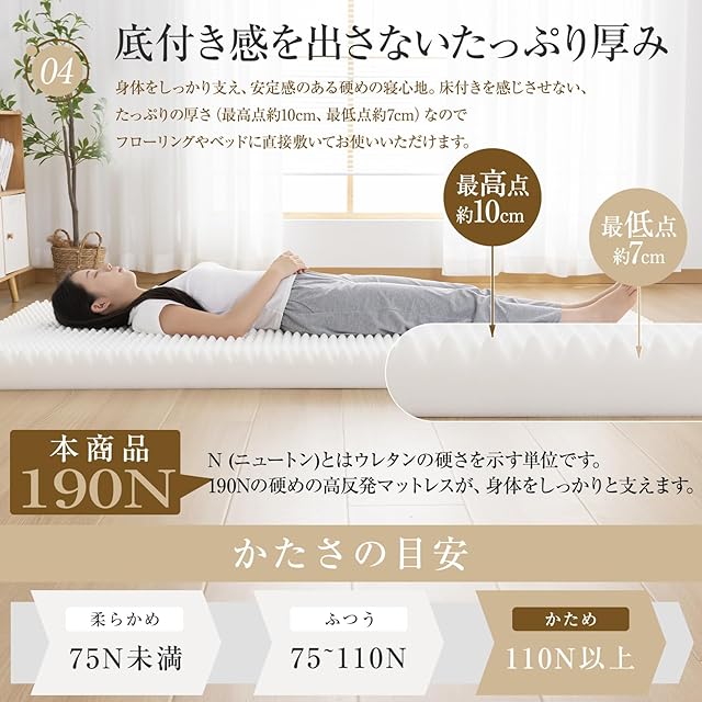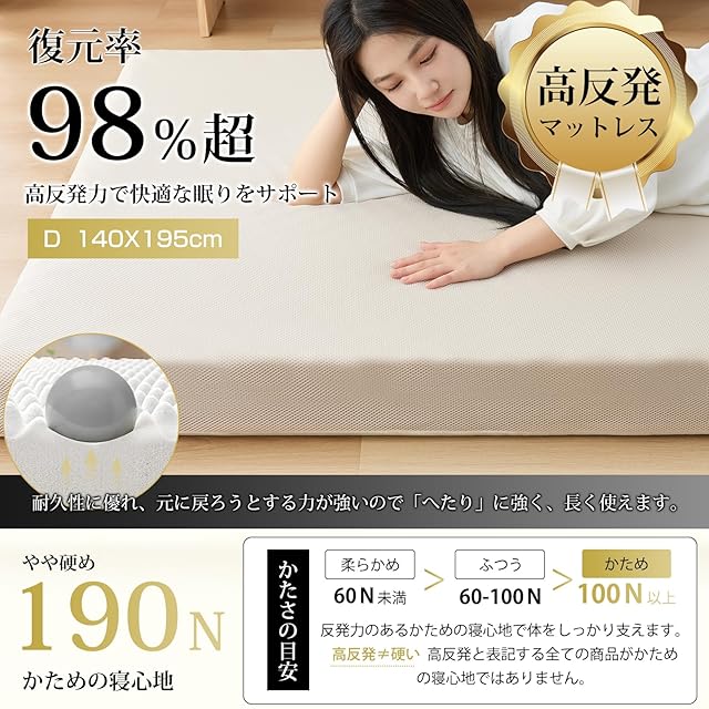 【高反発素材マットレス】弊社のマットレスは高反発素材を採用しており、優れた復元性とクッション性を兼ね備えています。復元率98%超高反発力で快適な眠りをサポートできます。密度24Dで、ぐっと押しても、すぐに戻る高反発マットレスです。10cm極厚でしっかりとした厚みとクッション性があるので、床に直接敷いても底つき感なく快適に使えます。やや硬め190Nの程よい硬さで、しっかり体を支えています。