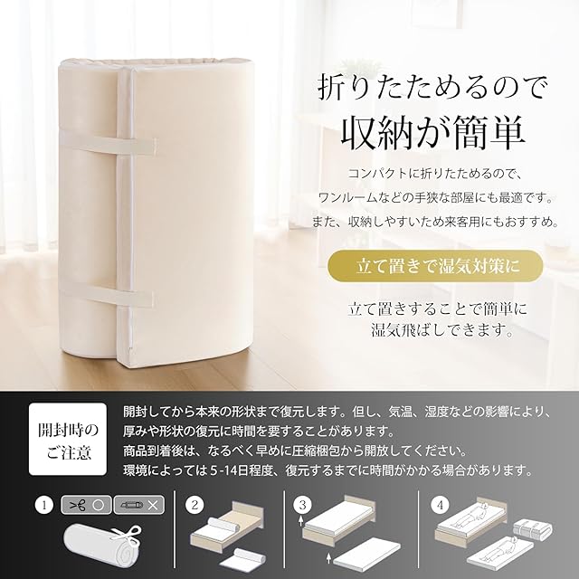 【コンパクトで収納便利】マットレスコンパクトに折りたためるので、ワンルームなどの手狭な部屋にも最適です。また、収納しやすいため来客用にもおすすめ。女性でも持ち運びもラクラクになります。コンパクトで様々な場所で使用できます。女性も楽に持ち運べます。また立て置きすることで簡単に湿気飛ばしできます。