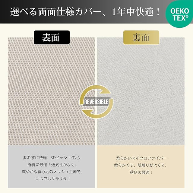 【四季適用&便利】マットレスは選べる両面仕様カバーを採用して、1年中快適で、オールシーズン適用です!表面は3Dメッシュ生地で通気性がよく、爽やかな寝心地で、いつでもサラサラ!裏面は柔らかいマイクロファイバーで、柔らかくて、肌触りがよくて、秋冬に最適!L字型ファスナーでらくらく着脱!カバーは取り外して洗濯可能で、いつも清潔にお使いいただけます。