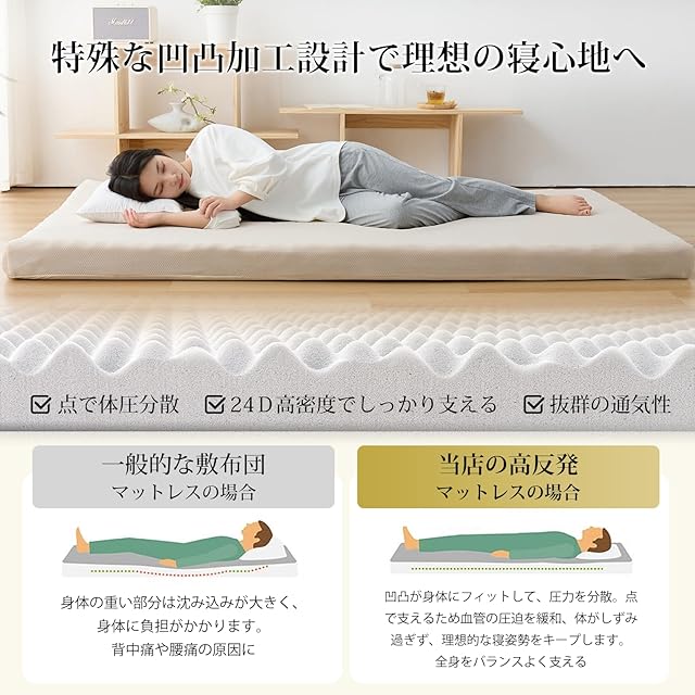 【凹凸加工、体圧分散】マットレスは特殊な凹凸加工設計で、面でなく点でフィットして、圧力を分散します。点で支えるため血管の圧迫を緩和、体がしずみ過ぎず、理想的な寝姿勢をキープします。全身をバランスよく支えて、体に負担のかからない快適な眠りをサポートします。