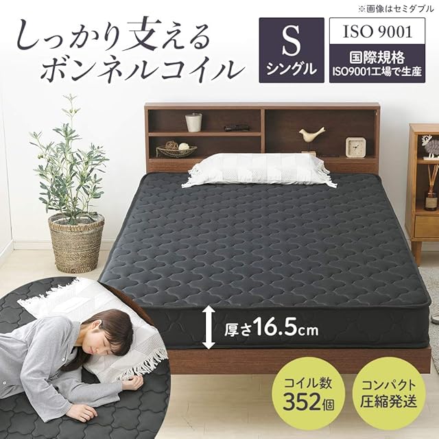 アイリスプラザ 長持ちボンネルコイルマットレス 厚さ16.5cm 連結コイル352個 ムレにくい高通気性 ISO9001取得工場で生産 表面やわらか 内側ウレタン2層構造 らくらく設置 圧縮梱包でお届け シングル ブラック BCMT-S