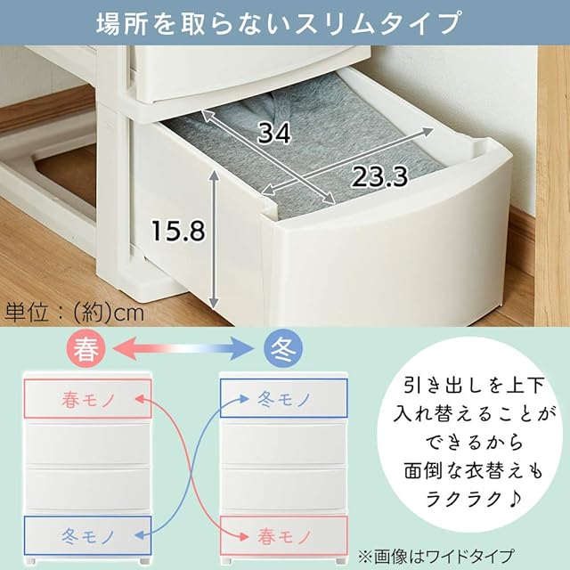 収納目安(引き出し1段あたり)は「Tシャツ:約20枚」または「バスタオル:約8枚」。