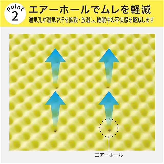 ウレタンに空気が通るエアーホールを設けました。湿気や汗を拡散・放湿し、睡眠中のムレを軽減。