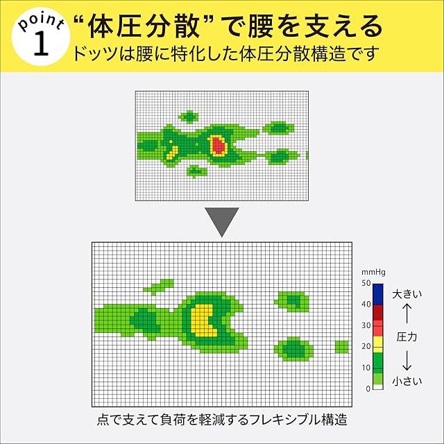 点で支えて負荷を軽減するフレキシブル構造。圧力が一点に集中せず圧迫部分を分散し、腰をやさしくサポートしてくれます。