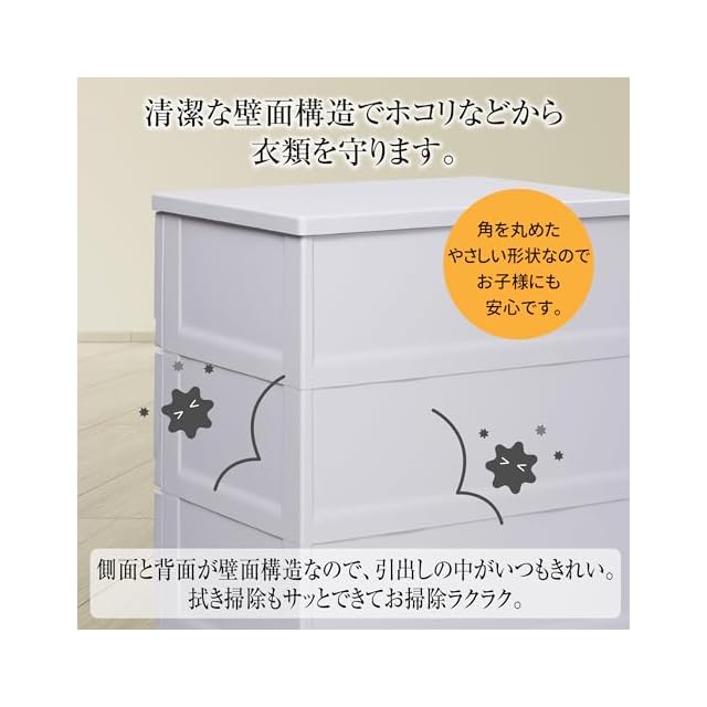 収納の目安(約):各引出しにトレーナーなら10枚、セーターなら6枚、Yシャツなら8枚