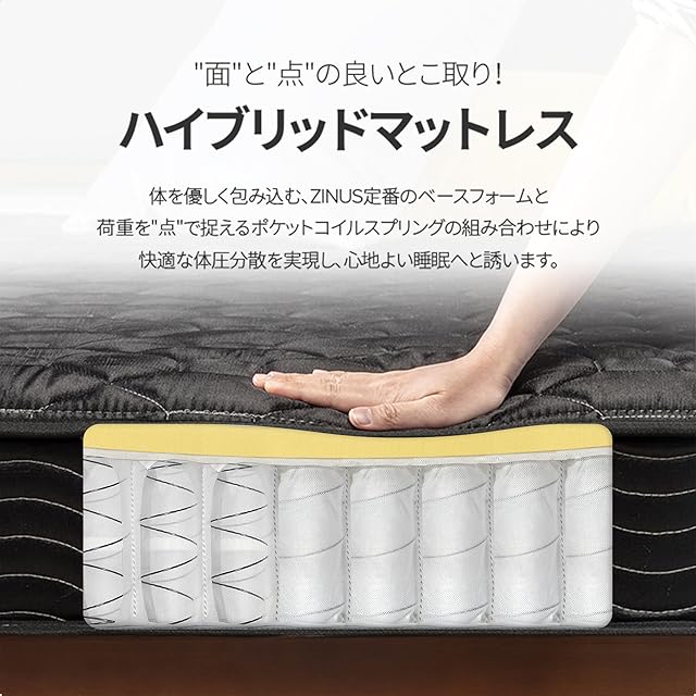 【ハイブリットマットレス】 底付き感を抑える高密度フォームと、独立コイルシステムの2層構造。ウレタンフォームとスプリングで体を包み込み、安眠へと誘います。