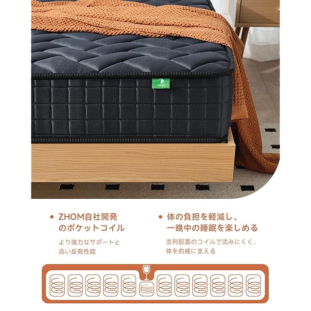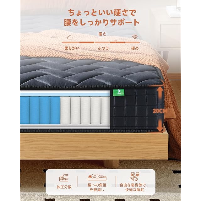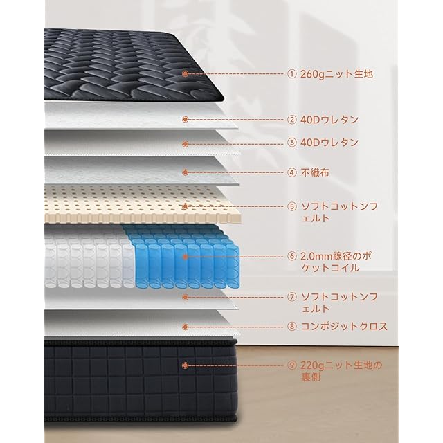 【並行配列ポケットコイル】:522個やや硬めの高級袋入り独立コイルスプリングを使用しています。並行配列で各コイルは体の異なる部位を個別にサポートし、精密なサポート力を提供します。独立したポケット包装により、コイル間の干渉を減らし、静かな睡眠環境を実現します。
