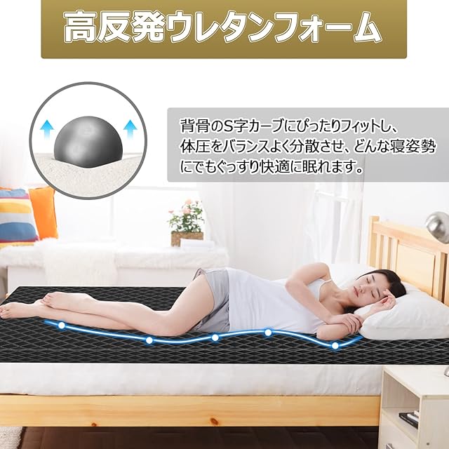 【最新設計・3つ独自開発の加工技術】日本の開発チームより新開発された高反発ウレタンフォームは背骨のS字カーブにぴったりフィットし、穴あけ加工も追加されたため、普通のウレタンより通気性、復元力に優れています。外カバーは特有の抗菌防湿・毛玉防止・汚れ防止加工を施しました。最高質感のマットレスで極上の寝心地を手に入れましょう!