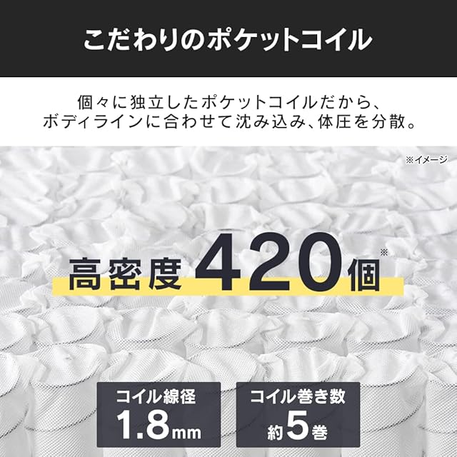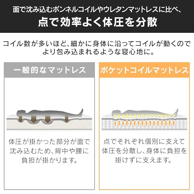 材質 側生地/表・サイド:ポリエステル100%、裏:不織布(ポリプロピレン100%)、充填物:ポケットコイル、ウレタンフォーム
