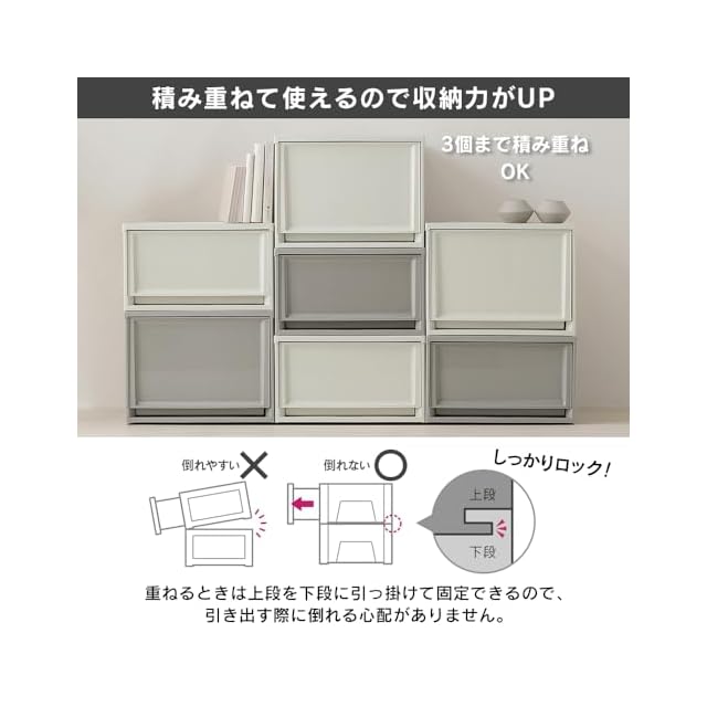【重ねて収納力を大幅UP】3段まで積み重ねて使用OK!重ねる際は上段を下段に引っ掛けて固定できるため、引き出す時などに倒れにくい。クローゼット内で空きがちなハンガー下のスペースも有効活用できる。(※3段以上の積み重ねは歪みたわみが生じる可能があります。)【“浅型”なら:ベッド下収納にもおすすめ】ベッド下のデッドスペースも有効活用できる。好きなカラーでアクセントにしても、落ち着いたカラーで生活感を抑えての使用も◎