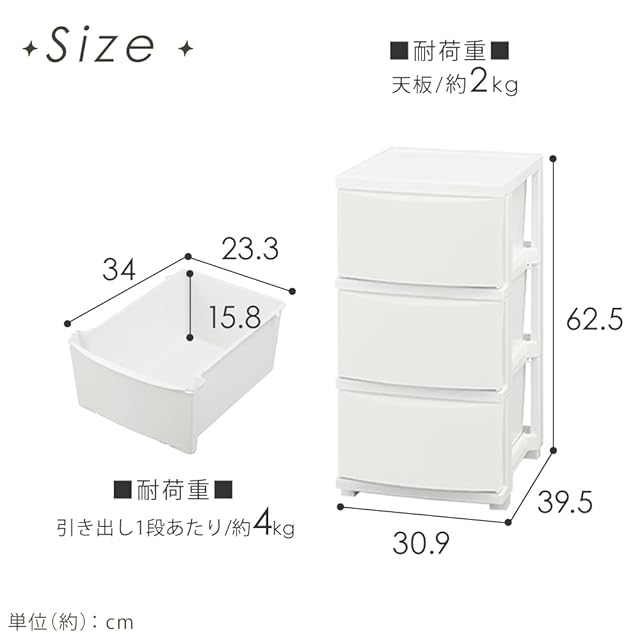収納目安(引き出し1段あたり)は「Tシャツ:約8枚」または「バスタオル:約2枚」。