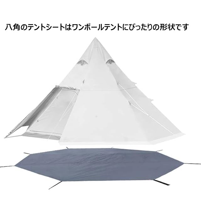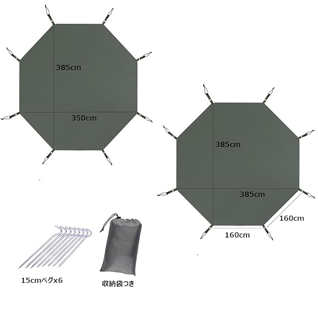 【製品仕様】八角グランドシートのサイズ:385x350cm;385x385cm;ペグ8本と収納袋つきです。折りたためばコンパクトに収納できます。八角形のグランドシートはワンポールテントにぴったりの形状です