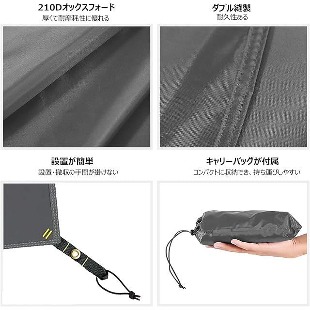 【厚手の210D生地】テントシートは210Dポリエステルオックス素材を採用し、強度不足の心配必要がない、薄い素材のシートより耐久性があります。優れた耐摩耗性があり、長年の使用でも摩耗しにくく、耐久性も優れます。防水性と耐久性を兼ね備えたテントシートです。