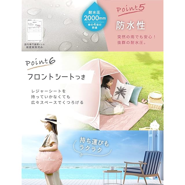 【組み立てがシンプル&スピーディー】 とことん使いやすさを追求し、テント組み立てに掛かる時間と煩わしい手順を大幅カット!専用ケースから取り出して手を放せば、5秒でぱっとテントが自動的に開きます。また、簡易シートも本体と一体になっているのでわざわざレジャーシートなどを敷く必要がありません。
