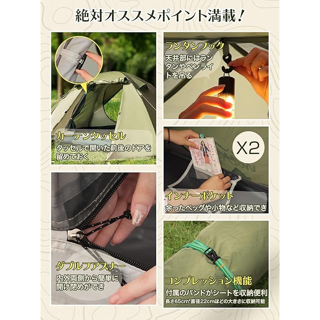 【こだわる機能満載】このテントは利便性にも配慮した設計で、開いたドアを留めるカーテンタッセル、内外両側から開閉可能なダブルファスナー付きのフロントシートとインナーメッシュ、寝室部分のランタンフック、小物収納に便利なインナーポケットなど、キャンプを快適にする機能が満載です。ランタンフックは夜間の照明用としてだけでなく、小物を吊るすのにも最適です。これらの工夫により、アウトドアライフをより快適に楽しむことができます。