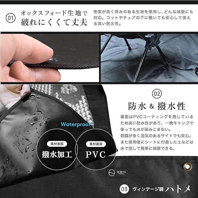 【オックスフォード生地で丈夫】 ・地面のゴツゴツした石や出っ張りを軽減。軽量な生地でありながら丈夫で破れる心配もない ・コットやチェアなどを上で使用しても破れ難く安心
