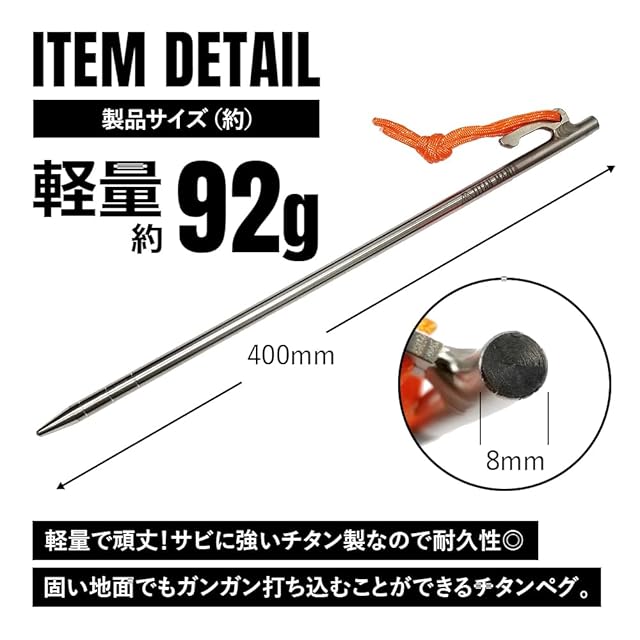 ✅【商品詳細】 サイズ(約):8×400mm、重量(約):92g、材質:チタン 【セット内容】 本体(40cmペグ)×6、収納袋