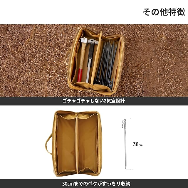 鍛造ペグ30cmを40本、ハンマー2本とガイロープが収納可能。