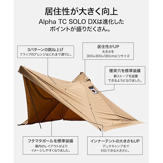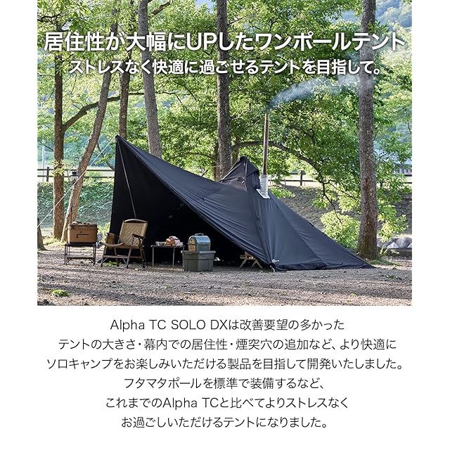 ✔【居住性が大幅にアップしたワンポールテント】Alpha TC SOLO DXは改善要望の多かったテントの大きさ、幕内での居住性、煙突穴の追加など、より快適にソロキャンプをお楽しみいただける製品を目指して開発いたしました。また、フタマタポールを標準装備するなど、これまでのAlpha TCに比べてよりストレスなくお過ごしいただけるテントになりました。 【より広く、より高く】既存のAlpha TCと比較して底面積が約1.5倍広く、高さが約1.2倍高いテントに仕上げました。男性だとテント内ではかがまないと出入りが難しかったのに比べてよりストレスなく過ごしていただける広さになっています。