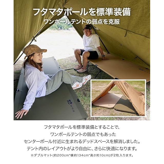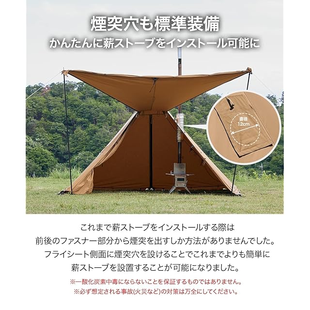 ✔【フタマタポールを標準装備】フタマタポールを標準装備することで、ワンポールテントの弱点でもあったセンターポール付近に生まれるデッドスペースを解消いたしました。これによりテント内のレイアウトがより自由に、更に快適になります。 【煙突穴も標準装備】これまで薪ストーブをインストールする際は前後のファスナー部分から煙突を出すしか方法がありませんでした。SOLO DXではフライシート側面に煙突穴を設けることでこれまでよりもかんたんに薪ストーブを設置することが可能になりました。 ※一酸化炭素中毒にならないことをするものではありません。 ※必ず想定される事故(火災)などの対策は万全にしてください。