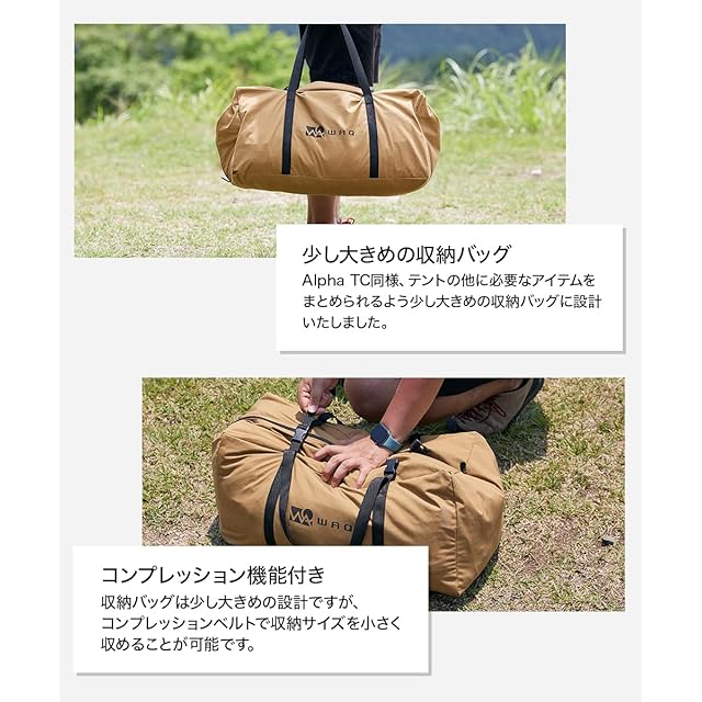 ✔【選べる3カラー】Alpha TC SOLO DXは豊富なカラーバリエーションでご用意。お使いのギアやキャンプスタイルに合わせてお好きなカラーをお選びいただけます。 【その他のスペック】・ベンチレータを2箇所に配置:Alpha TC同様テント内の空気の循環が良くなるよう上部2箇所にベンチレータを設置いたしました。・デュオまで対応可能なインナーテント:インナーテントを290cm x 150cmに設定しました。大人2名が横並びで寝られる大きさのため、ソロの場合はテント内に荷物を置くなども可能です。・大きめの収納バッグ:テントの他に必要なアイテムを一緒に収納することが可能です。