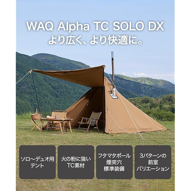 WAQ Alpha TC SOLO DX ソロ用テント デュオ用テント 1-2人用 シェルター ティピテント オールシーズン 煙突穴付き フタマタポール ワンポール スカート (TAN(タン))