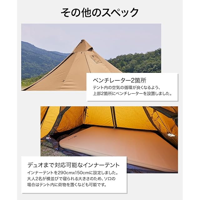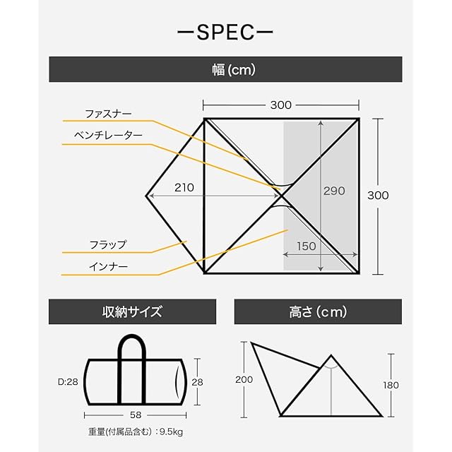 ✔【製品概要】カラー:タン / オリーブ / ブラック・サイズ(展開時):300 x 300 x 160 (cm)・重量:約9.5kg・材質ポリコットン(ポリエステル65%、綿35%))、アルミ合金 ・セット内容 フライシート x 1 インナーテント x 1 メインポール x 1 サブポール x 2 コンプレッションベルト付きキャリーバッグ x 1 ロープ✕6本(4本はテントに取り付け済) ペグ✕16本
