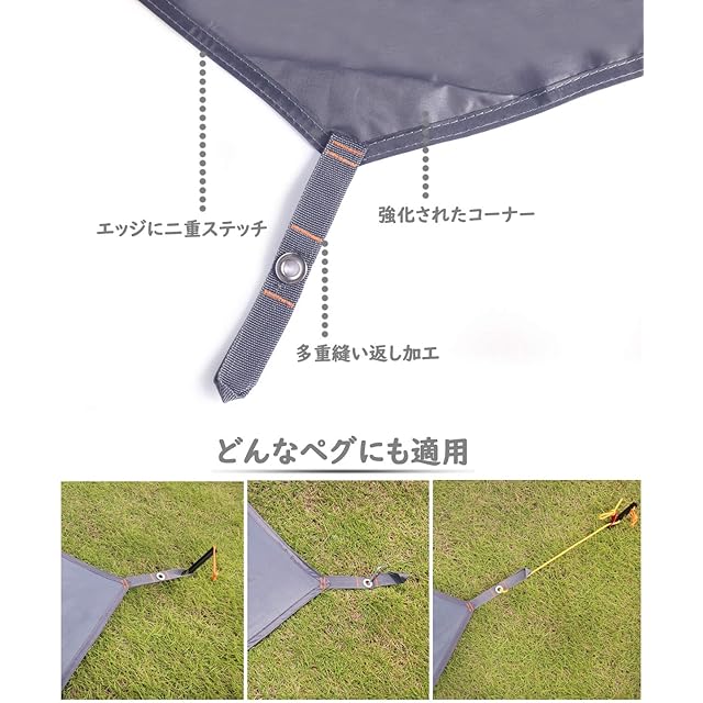 多用途:テントシートの各角に金属ハトメがあります。ロープや2つのポールを使用することでフライシート、ハンモックのカバー、日陰/雨の天幕タープなどを簡単に設置することができます。さらに、広い面積を確保した軽量レジャーシートです、数人一緒に使られます