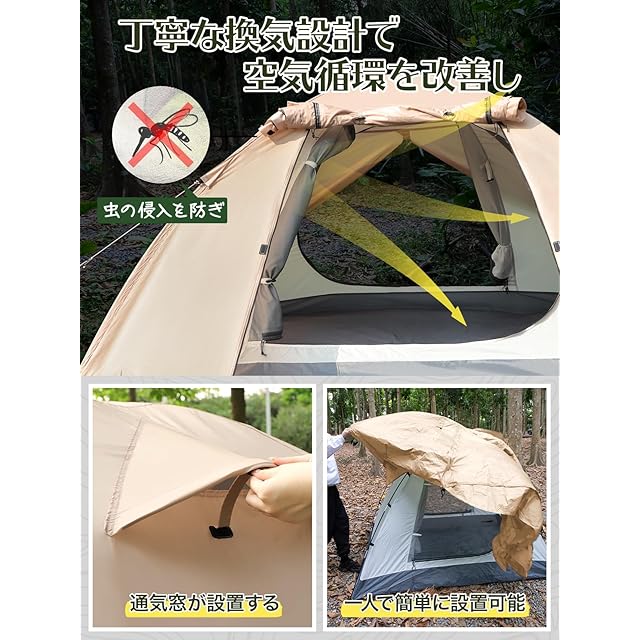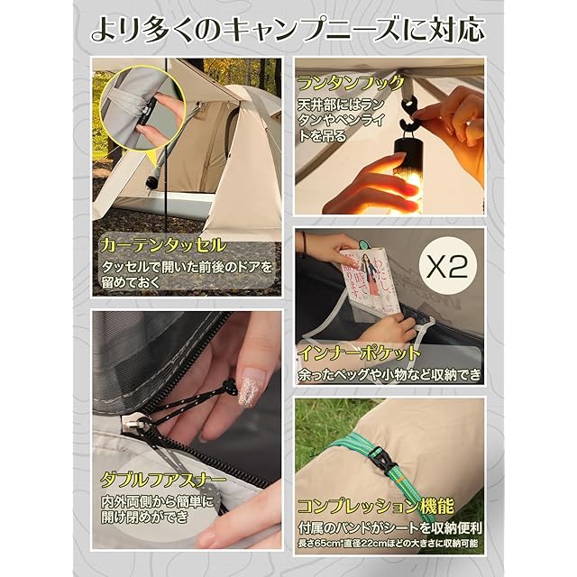 【こだわる機能満載】このテントは防虫機能に特に優れており、高密度メッシュ生地を使用することで通気性を保ちつつ蚊などの害虫を完全にシャットアウトします。インナーテントの網目は細かく設計されており、蚊帳としても十分な性能を発揮します。さらに利便性にも配慮した設計で、開いたドアを留めるカーテンタッセル、内外両側から開閉可能なダブルファスナー付きのフロントシートとインナーメッシュ、寝室部分のランタンフック、小物収納に便利なインナーポケットなど、キャンプを快適にする機能が満載です。ランタンフックは夜間の照明用としてだけでなく、小物を吊るすのにも最適です。これらの工夫により、アウトドアライフをより快適に楽しむことができます。