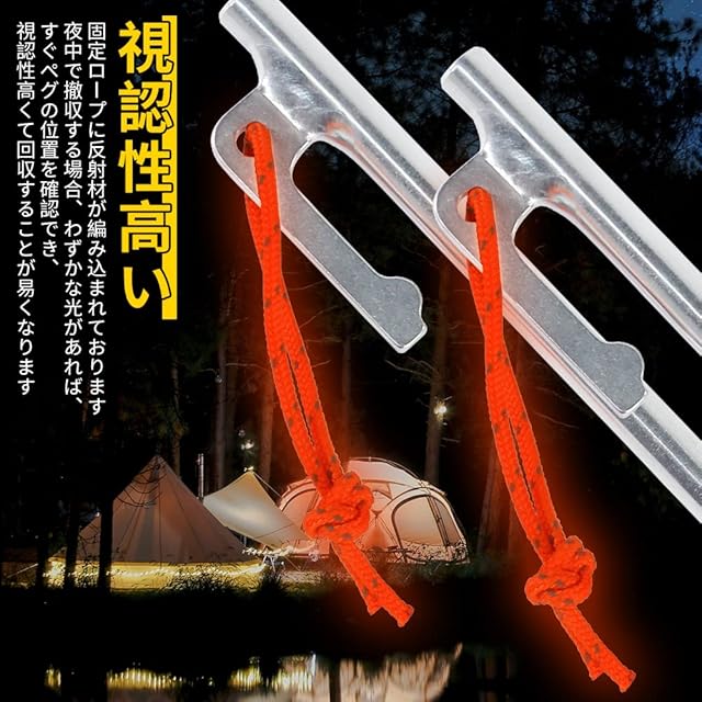 デザイン性高い:本製品の固定ロープに反射材が編み込まれております。夜中で撤収する場合、わずかな光があれば、すぐペグの位置を確認でき、視認性高くて回収することが易くなります。