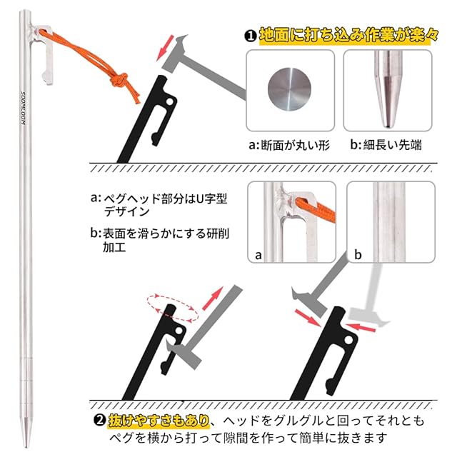 テント/タープ設営に活躍している:強度高いチタン合金製のペグはスチールより強度が高く、折れ曲がることはない!砂利、岩場、砂浜や雪地面などの多少硬い地面にも突き刺さりますので、テント/タープ設営に活躍しています。